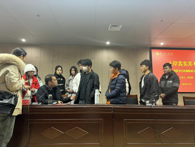 本次活动主讲人是我校校友田科明,他拥有17年市、县、乡多岗位工作经历,并多次担任公务员面试考官,拥有丰富的公务员面试辅导经验,曾辅导的考生多人成功上岸。田科明以“上岸其实并不难”为题,首先通过分析大学生择业心态与就业趋势,结合实际现状,详尽介绍了公务员的职位优势、国考考情以及适合考公人群等内容。接着,着重讲解了笔试如何准备、什么是备考黄金期、面试高分需要具备的三种思维等核心内容。他鼓励同学们要尽早提升道德素养,锻炼表达能力,培养公务员思维,做到常学常新、与时俱进。此外,田科明还对选调生的具体分类及差异性招录条件、事业编与三支一扶等行业的优缺点展开了分享。最后,现场互动环节,以往届高质量题目为例,田科明为大家进行答题范例的展示,同学们积极回应,现场氛围轻松活跃。讲座后,同学们学习热情高涨,继续向田科明咨询请教,并纷纷表示受益匪浅。