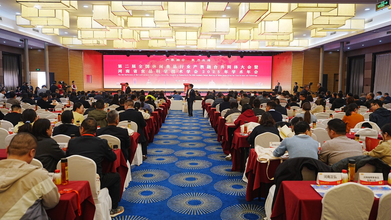 2025年11月1日-2日,以“产教融合 聚力出海”为主题的第二届全国休闲食品行业产教融合共同体大会暨河南省食品科学技术学会2025年学术年会在郑州盛大召开。大会由全国休闲食品行业产教融合共同体主办,郑州轻工业大学承办,来自全国60余所高校、科研院所、行业协会以及国内外休闲食品龙头企业的600余名代表齐聚一堂,共同探讨休闲食品产业创新发展与产教融合协同育人新路径。