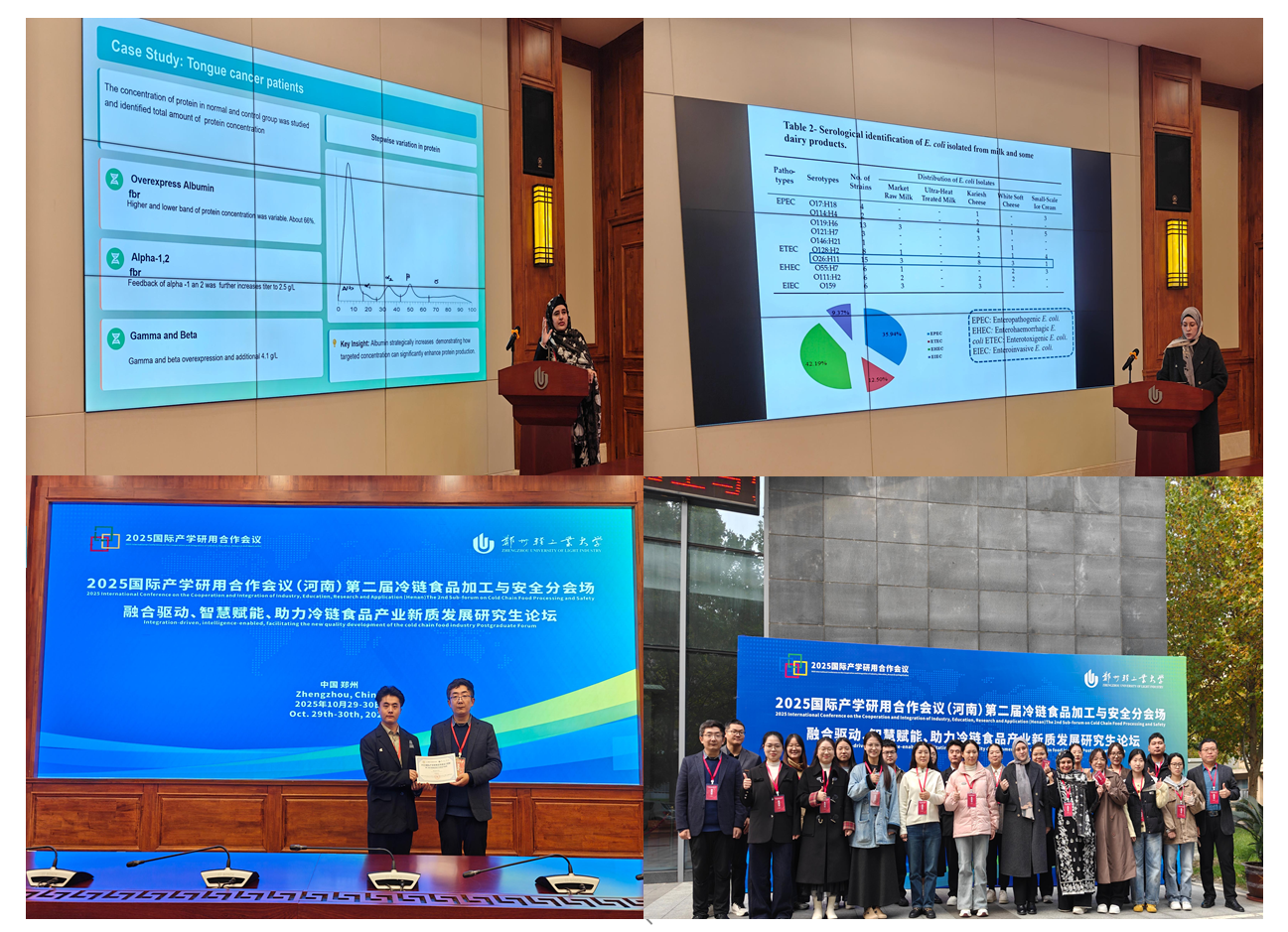 本次会议以“融合驱动、智慧赋能、助力冷链食品产业新质发展”为主题,推动教育链、人才链、创新链与产业链深度融合,交流冷链食品加工与安全前沿学术成果,促进国际合作,为冷链食品产业新质发展和创新寻求方案。来自新西兰梅西大学、加拿大萨斯喀彻温大学、意大利卡梅里诺大学、诺丁汉大学、利兹大学、中国科学院兰州化学物理研究所、西北农林科技大学、山东农业大学、河南科技大学、河南科技学院、好想你健康食品股份有限公司、河南华昱控股有限公司、郑州轻工业大学等国内外高校、科研机构和企业的专家、学者作大会报告,并围绕会议主题进行了深入研讨。研究生论坛环节,来自埃及曼苏拉大学、巴基斯坦费萨拉巴德女子大学、省内高校硕博研究生22位代表围绕冷链食品领域的研究进展展开了深入交流。