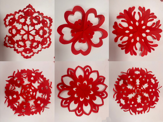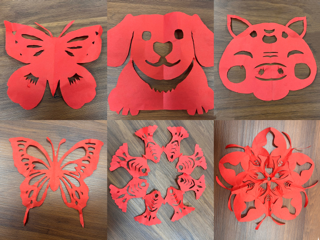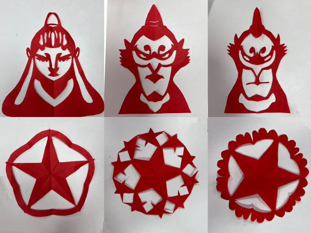 活动伊始,工作人员通过PPT系统讲解了剪纸的历史脉络,阐释了“福到”“喜上眉梢”等经典图案的吉祥寓意及其在节日装饰、民俗传承中的实用价值。随后,具体演示了一些剪纸的基础技法,通过设计起稿、固定纸张、剪刻修饰等关键步骤,帮助同学们快速掌握要领。实践环节中,同学们以彩纸为笺,执剪刀为笔,迫不及待投入创作中。有的精心剪出“福到家门”“年年有余”等传统纹样,将美好祝愿凝于方寸之间;有的创作寓意平安的苹果、象征喜庆的小猪,把朴素的生活愿景融入指尖艺术中;还有的剪出灵动的小狗、蝴蝶、五角星等童趣造型,着意抒写童心意趣;更有同学巧妙融合流行文化,细腻刻画《哪吒》等人物形象,以精湛技法展现传统与时代的创意对话。大家热情投入,一刀一剪之间,既是对传承技艺的传承,更是与千年文化的深度共鸣。